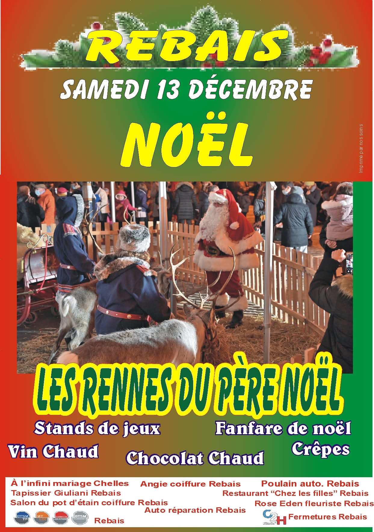 Samedi 13 décembre 2025Rebais en fête avec les "vrais" rennes du Père Noël stands de jeux fanfare de Noël vin chaud crêpes